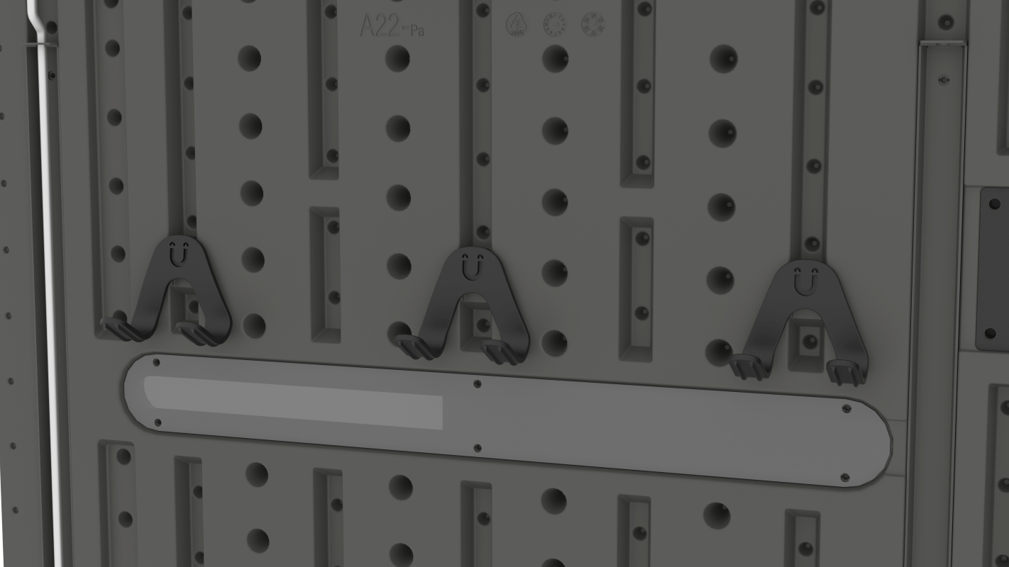 V základní výbavě nechybí dvě praktické police a pět plastových háčků, díky nimž budete mít veškeré vybavení vždy přehledně uspořádané. Pro ještě větší komfort je možné domek doplnit o LED světlo s pohybovým PIR senzorem, které se automaticky rozsvítí při vstupu.