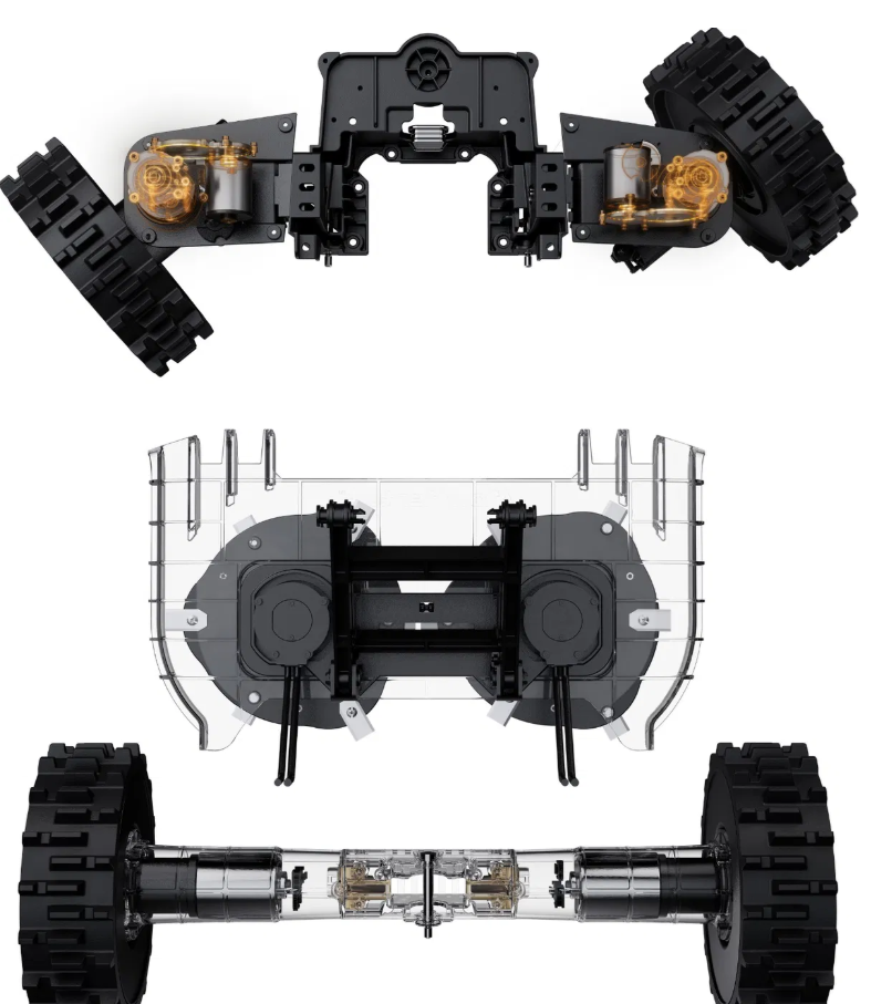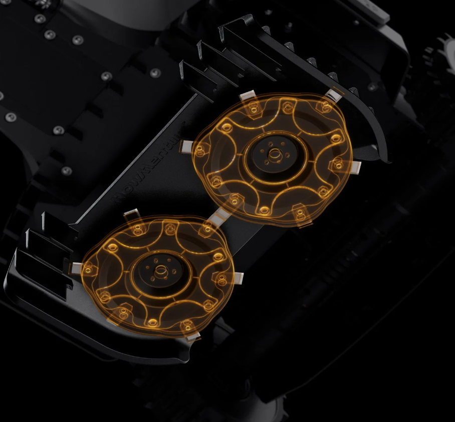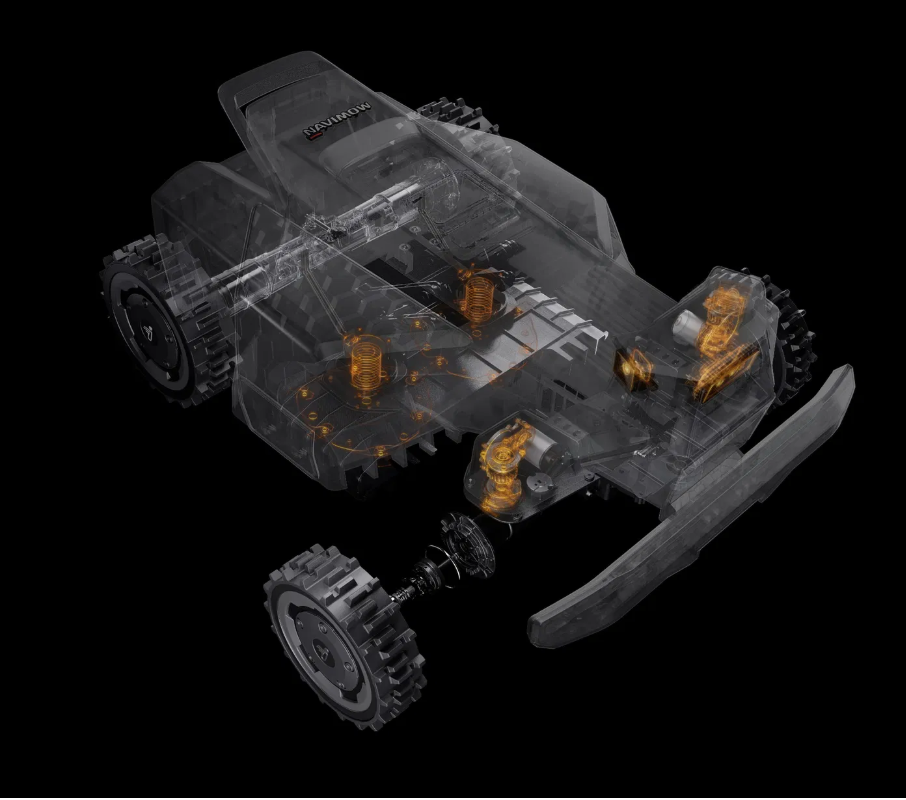 Model X-450E AWD je vybaven systémem dvojitého odpružení, který byl speciálně vyladěn pro pohyb v náročném terénu (ORV). Bez námahy tak zvládá jakýkoliv složitý povrch – od kamenných cest a vysokých obrubníků až po terénní výmoly. Tato robustní konstrukce zajišťuje stabilní stoupání a bezproblémové překračování překážek, čímž zaručuje plynulý průběh práce i tam, kde by standardní robotické sekačky uvízly.